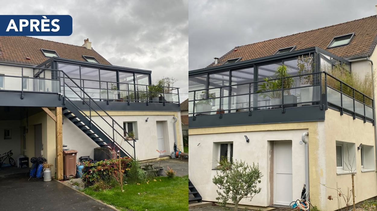 Les travaux ont également compris la mise en œuvre d’une étanchéité EPDM, la pose d’un carrelage sur plots, ainsi que la réfection d’une dalle béton pour le support intérieur de la véranda.