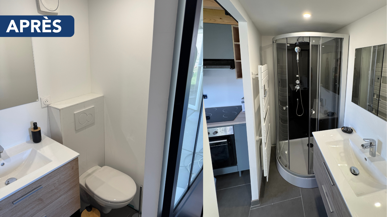La salle de bain a été entièrement équipée avec la pose d’un WC, d’une douche moderne, ainsi qu’un meuble vasque accompagné de son miroir.